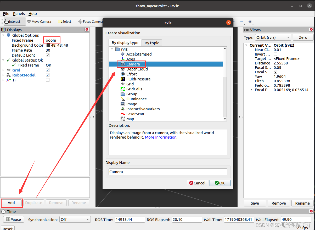 将rviz中的Fixed Frame 设置为 odom , 在Add添加Camera: