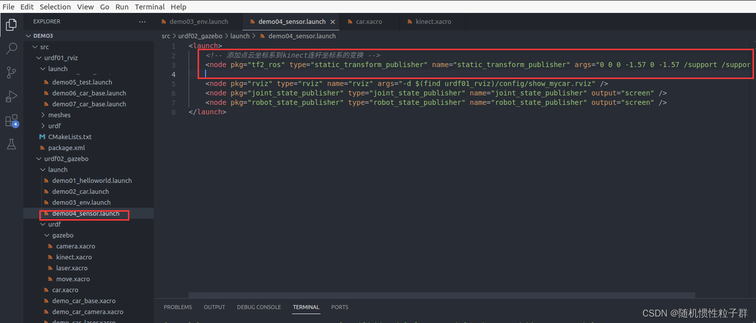 2.发布新设置的坐标系到kinect连杆的坐标变换关系,在启动rviz的launch中,添加: