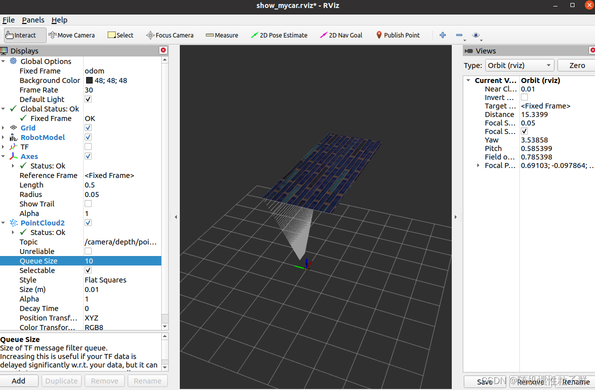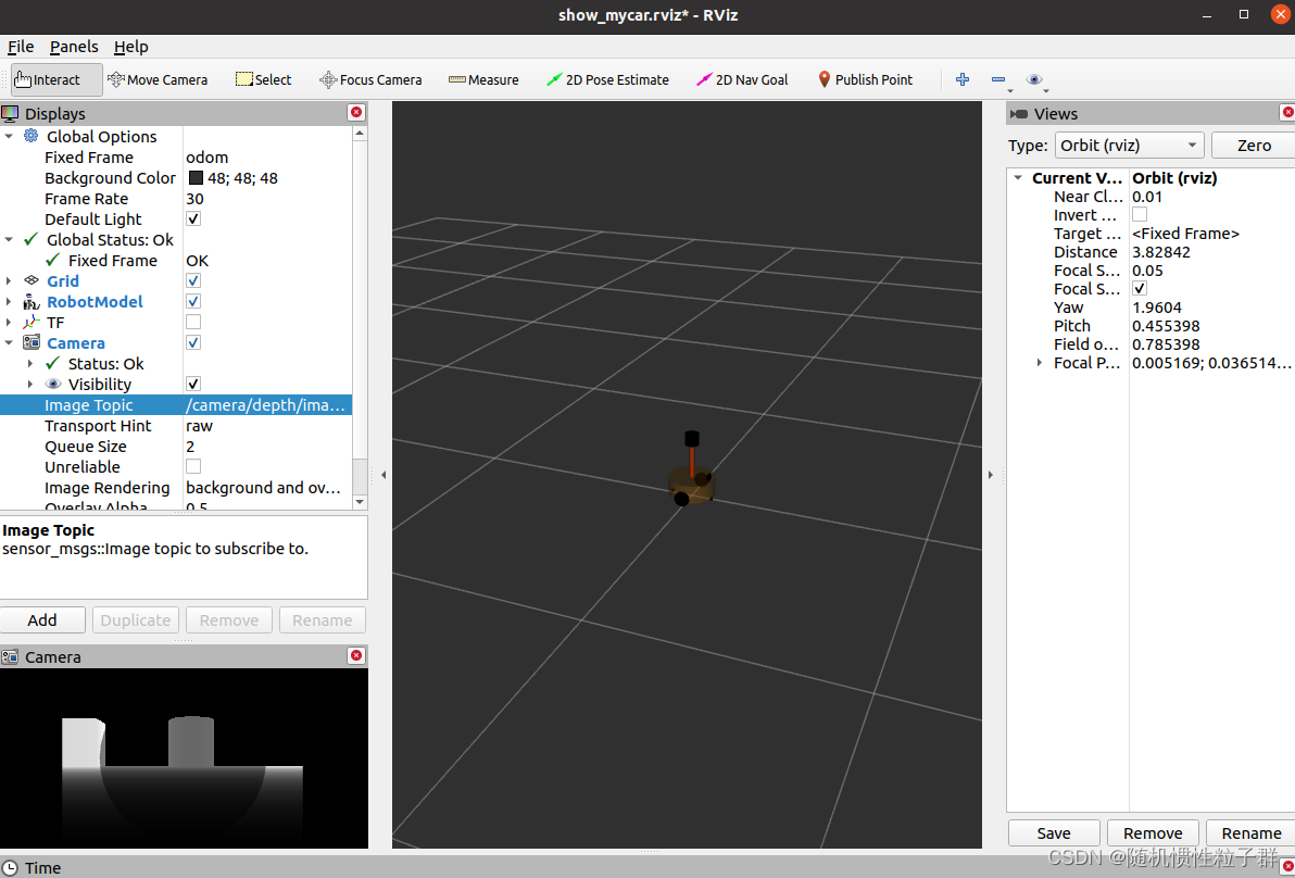 将rviz中的Fixed Frame 设置为 odom , 在Add添加Camera. 再设置Camera中的Topic为/camera/depth/image_raw,接着可以在gazebo仿真中运动小车,新开一个终端,执行指令(需要Tab补齐):