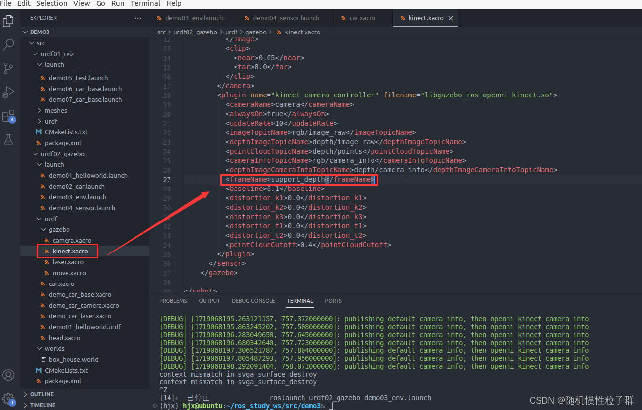 1.在插件中为kinect设置坐标系,修改配置文件的<frameName>标签内容: