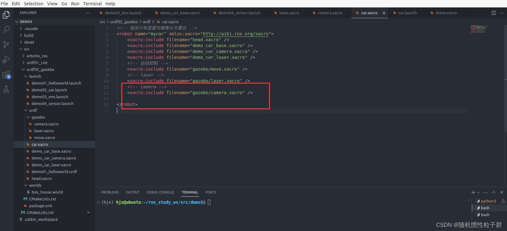 在urdf文件夹中的gazebo文件夹中新建一个camera.xacro文件:
