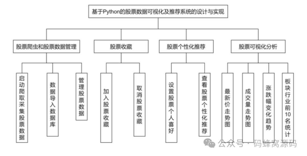 股票数据可视化及推荐系统的重要核心功能股票数据爬取、股票浏览、股票收藏、股票个性化推荐、股票评论、股票可视化分析等。具体功能模块如下: