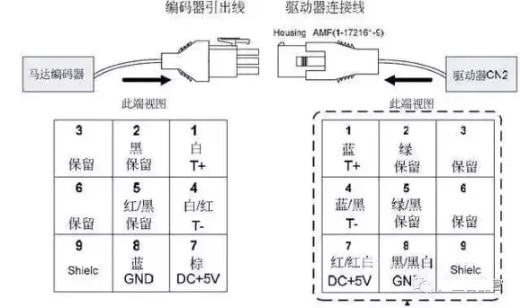 从上图看出九个端子我们只使用了5个,一个屏蔽线、电源线两根、串行通讯信号(+-)两根,与我们普通的编码器接线差不多。