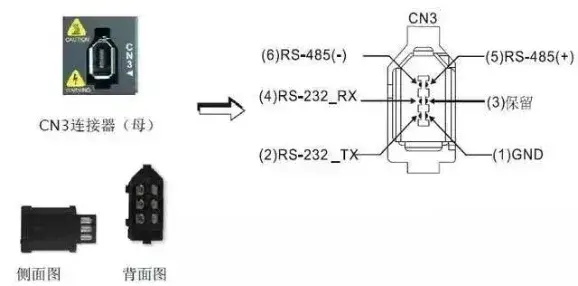 驱动器通过CN3端口与电脑PLC、HMI等上位机相连接,采用MODBUS通讯来控制驱动器,可使用RS232、RS485进行通讯。