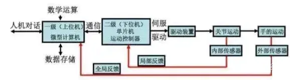 1、具体流程:主控计算机接到工作人员输入的作业指令后,首先分析解释指令,确定手的运动参数。然后进行运动学、动力学和插补运算,最后得出机器人各个关节的协调运动参数。这些参数经过通信线路输出到伺服控制级,作为各个关节伺服控制系统的给定信号。关节上的伺服驱动器将此信号D/A转换后驱动各个关节产生协调运动。传感器将各个关节的运动输出信号反馈回伺服控制级计算机形成局部闭环控制,达到精确的控制机器人在空间的运动。