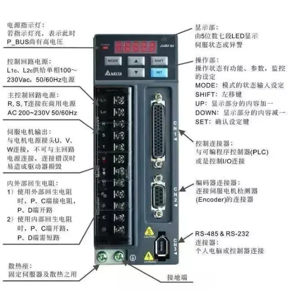 伺服驱动器主要有控制回路电源、主控制回路电源、伺服输出电源、控制器输入CN1、编码器接口CN2、连接起CN3。控制回路电源是单相AC电源,输入电源可单相、三相,但是必须是220v,就是说三相输入时,咱们的三相电源必须经过变压器变压才能接,对于功率较小的驱动器,可单相直接驱动,单相接法必须接R、S端子。伺服电机输出U、V、W切记千万不能与主电路电源连接,有可能烧毁驱动器。CN1端口主要用于上位机控制器的连接,提供输入、输出、编码器ABZ三相输出、各种监控信号的模拟量输出。