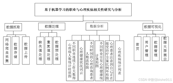 作为大数据分析系统,数据采集、数据处理、数据分析和数据可视化是基于机器学习的职业与心理疾病相关性研究与分析具备的基本素质。除此之外,本系统在用户交互方面做到了傻瓜式一键交互,按下按键,功能完成。数据抓取、数据存储、数据导入、数据清洗、数据预处理、数据分析、数据挖掘和数据可视化等种种功能都不在话下,通过图形操作界面摆脱了繁琐的实现过程。从意义方面,系统主要处理大量心理信息数据,对这些数据进行分析,并按需求进行可视化,从中提取心理者所需要的信息,给用户带来价值。系统功能结构如图3-1所示。