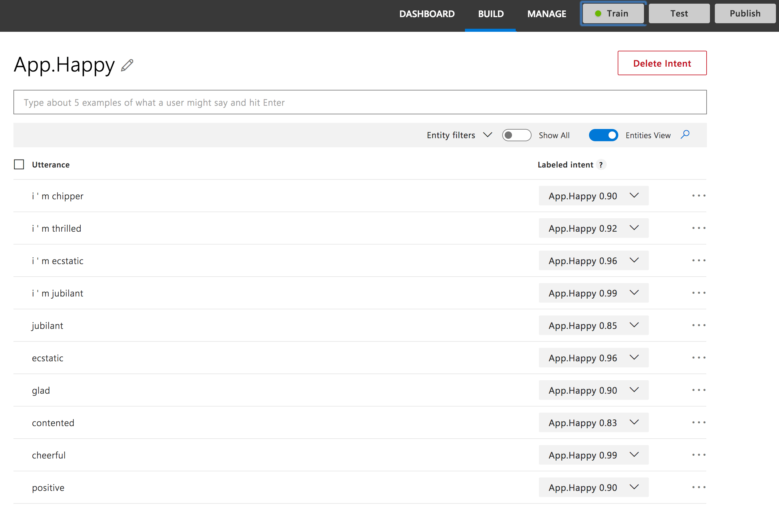 您可以看到我们有很多用于训练的同义词,但是当我们准备开始训练模型时,在上方也有“ Train”按钮。 我们单击该按钮,获得成功通知,然后就可以发布了。 😀