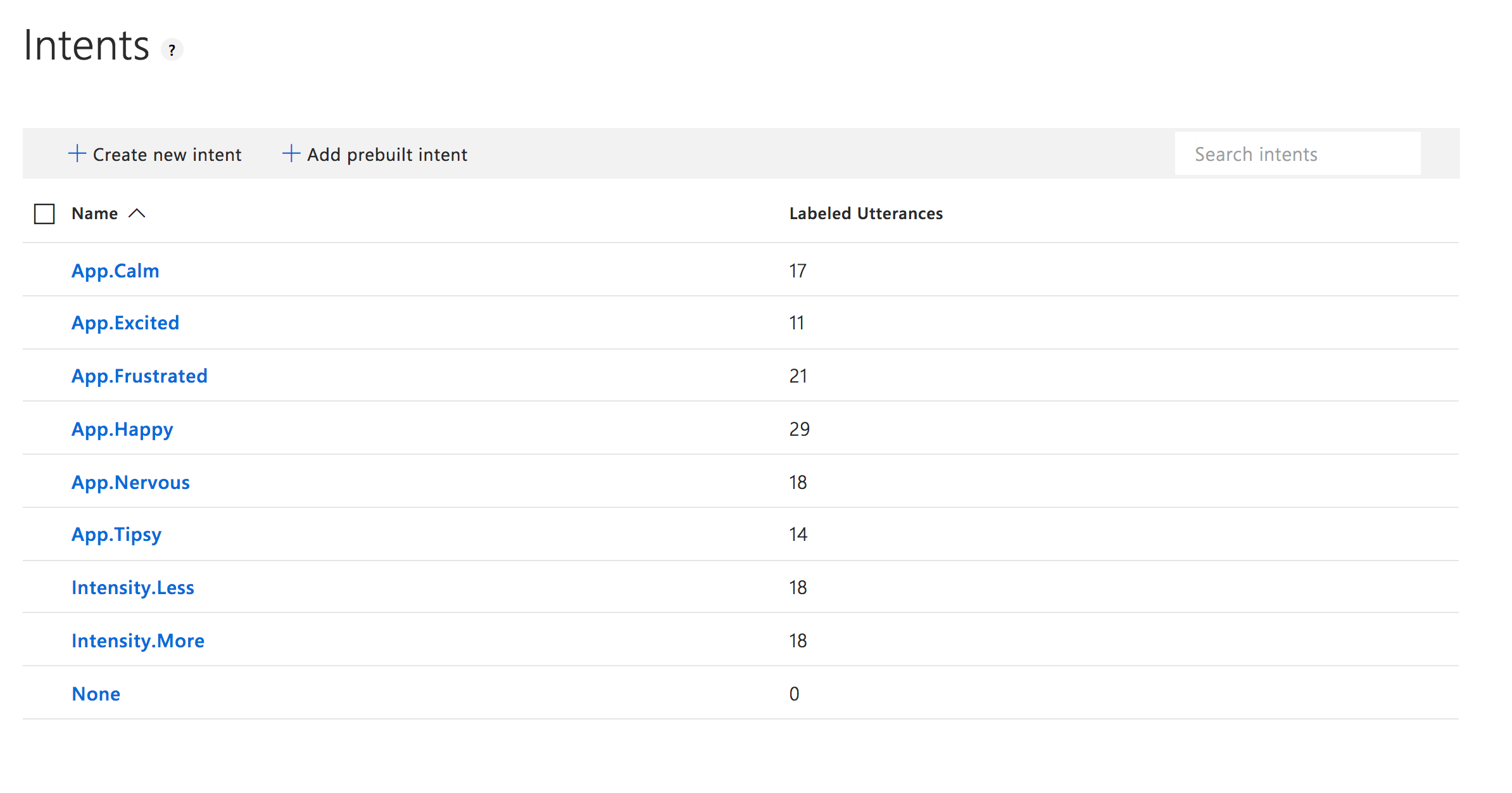 您可能会注意到我们这里有一个命名架构。 我们这样做是为了更容易对意图进行分类。 我们将首先弄清楚情绪,然后听强度,因此初始意图会以App (主要用于App.vue组件)或Intensity App.vue 。