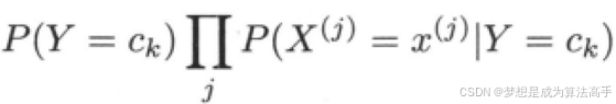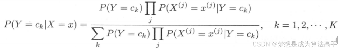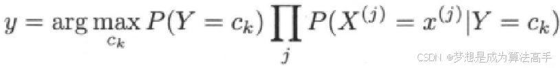 当我们有一个函数y = f(x)时,若有结果x0 = argmax(f(x)),则表示当函数f(x)取x = x0的时候,得到f(x)在取值范围内的最大值,上式表示朴素贝叶斯法会将样本分到后验概率最大的类别中。上式中x代表特征的取值,Y=Ck代表Ck这个类别,j代表第j个特征,分母是全概率公式,对于所有类别都是一样的,对结果没有影响,通过。:是指在考虑了新数据或证据之后,对事件概率的重新评估。其中