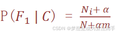 上式中α是拉普拉斯平滑系数,一般指定为1,Ni是特征F1中类别为C的样本数量,N是类别为C的样本总数,m 表示所有独立样本的总数。