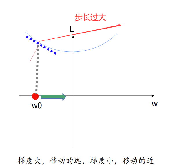 第二步, L L L对 w w w求偏导,并求在 w 0 w_{0} w0点处的值,学过高等数学的同学会很好理解,其目的就是为了观察,当 w w w变化时, L L L是如何变化的,如果当此时偏导值大于0,就说明随着 w w w的增大, L L L的值也会增大,此时我们应该将 w w w减小,以保证 L L L的值减小。这为我们进一步优化 w w w提供了方向。