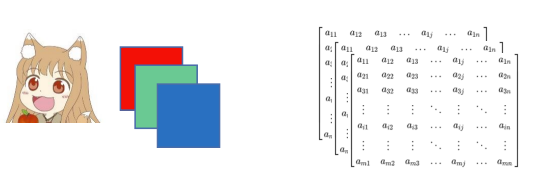 - 矩阵/张量:图片,图片是由多个像素点构成,而每个像素点上不同的RGB值构成了不同颜色,因此一张图片可以由矩阵表示