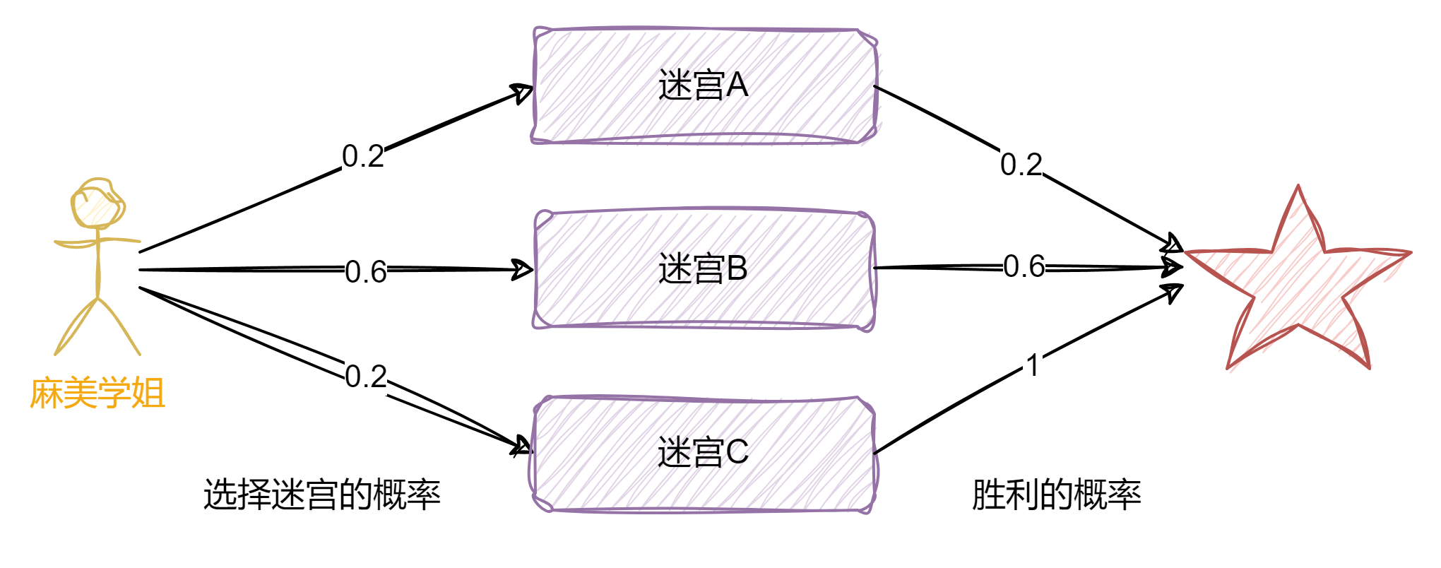 将公式带入这个问题的话,也就是,选择迷宫A的概率=选择迷宫A且胜利的概率 / 胜利的概率