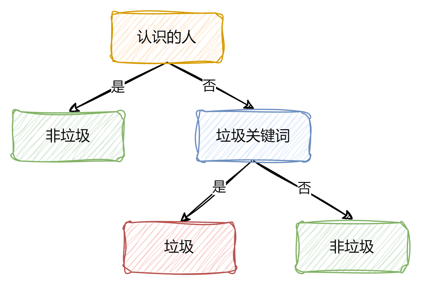 思考:如果出现了,一个没有垃圾关键词的邮件,但它确实是一封垃圾邮件,这一情况该怎么办?那么此时我们可以再添加一些其他特征(如是否存在链接等)来完善模型。这也暴露了决策树的一个缺点,就是决策树不善于处理未见过的特征 。