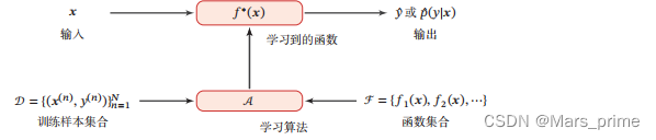 其中𝐼(⋅)为指示函数,|𝒟′ |为测试集大小.图给出了机器学习的基本流程.对一个预测任务,输入特征向量为 𝒙,输 出标签为𝑦,我们选择一个函数集合ℱ,通过学习算法𝒜和一组训练样本𝒟,从ℱ 中学习到函数𝑓 ∗ (𝒙).这样对新的输入𝒙,就可以用函数𝑓 ∗ (𝒙)进行预测.![]()