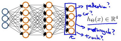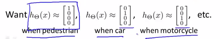 当我们有不止两种分类时(也就是 y = 1 , 2 , 3 … . y=1,2,3…. y=1,2,3….),比如以下这种情况,该怎么办?如果我们要训练一个神经网络算法来识别路人、汽车、摩托车和卡车,在输出层我们应该有4个值。例如,第一个值为1或0用于预测是否是行人,第二个值用于判断是否为汽车。