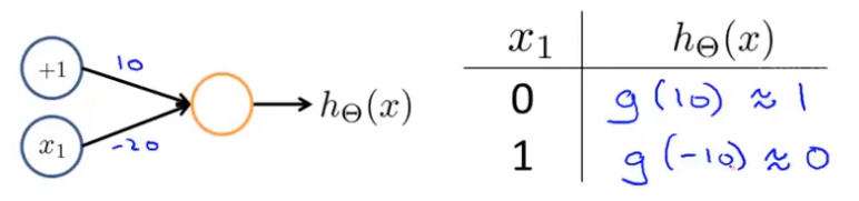 下图的神经元(两个权重分别为 10,-20)可以被视为作用等同于逻辑非(NOT):