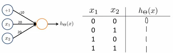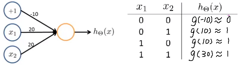 下图的神经元(三个权重分别为-10,20,20)可以被视为作用等同于逻辑或(OR):