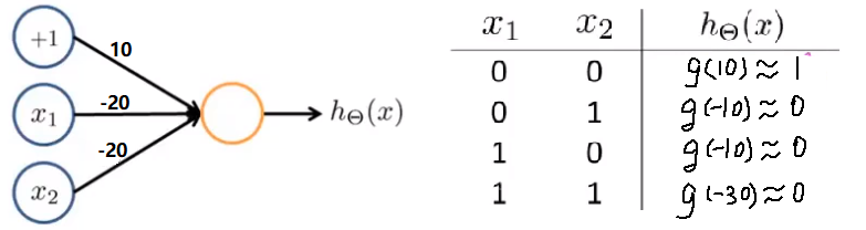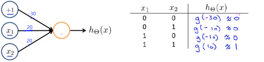 所以我们有: h Θ ( x ) ≈ x 1 AND x 2 h_\Theta(x) \approx \text{x}_1 \text{AND} \, \text{x}_2 hΘ(x)≈x1ANDx2