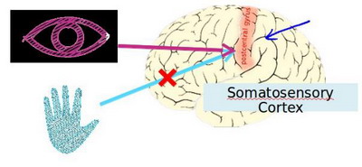 神经系统科学家做了下面这个有趣的实验,把耳朵到听觉皮层的神经切断。在这种情况下,将其重新接到一个动物的大脑上,这样从眼睛到视神经的信号最终将传到听觉皮层。如果这样做了。那么结果表明听觉皮层将会学会“看”。这里的“看”代表了我们所知道的每层含义。所以,如果你对动物这样做,那么动物就可以完成视觉辨别任务,它们可以看图像,并根据图像做出适当的决定。它们正是通过脑组织中的这个部分完成的。下面再举另一个例子,这块红色的脑组织是你的躯体感觉皮层,这是你用来处理触觉的,如果你做一个和刚才类似的重接实验,那么躯体感觉皮层也能学会“看”。这个实验和其它一些类似的实验,被称为神经重接实验,从这个意义上说,如果人体有同一块脑组织可以处理光、声或触觉信号,那么也许存在一种学习算法,可以同时处理视觉、听觉和触觉,而不是需要运行上千个不同的程序,或者上千个不同的算法来做这些大脑所完成的成千上万的美好事情。也许我们需要做的就是找出一些近似的或实际的大脑学习算法,然后实现它大脑通过自学掌握如何处理这些不同类型的数据。在很大的程度上,可以猜想如果我们把几乎任何一种传感器接入到大脑的几乎任何一个部位的话,大脑就会学会处理它。