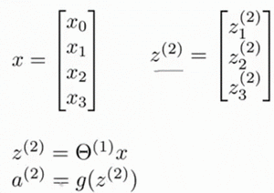 a 1 ( 2 ) = g ( Θ 10 ( 1 ) x 0 + Θ 11 ( 1 ) x 1 + Θ 12 ( 1 ) x 2 + Θ 13 ( 1 ) x 3 ) a_{1}^{(2)}=g(\Theta _{10}^{(1)}{{x}_{0}}+\Theta _{11}^{(1)}{{x}_{1}}+\Theta _{12}^{(1)}{{x}_{2}}+\Theta _{13}^{(1)}{{x}_{3}}) a1(2)=g(Θ10(1)x0+Θ11(1)x1+Θ12(1)x2+Θ13(1)x3)
