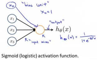 神经网络模型建立在很多神经元之上,每一个神经元又是一个个学习模型。这些神经元(也叫激活单元,activation unit)采纳一些特征作为输出,并且根据本身的模型提供一个输出。下图是一个以逻辑回归模型作为自身学习模型的神经元示例,在神经网络中,参数又可被称为权重(weight)。