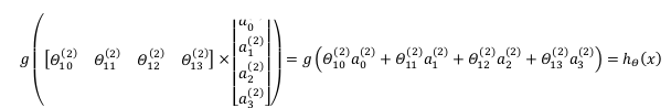 h Θ ( x ) = g ( Θ 10 ( 2 ) a 0 ( 2 ) + Θ 11 ( 2 ) a 1 ( 2 ) + Θ 12 ( 2 ) a 2 ( 2 ) + Θ 13 ( 2 ) a 3 ( 2 ) ) {{h}_{\Theta }}(x)=g(\Theta _{10}^{(2)}a_{0}^{(2)}+\Theta _{11}^{(2)}a_{1}^{(2)}+\Theta _{12}^{(2)}a_{2}^{(2)}+\Theta _{13}^{(2)}a_{3}^{(2)}) hΘ(x)=g(Θ10(2)a0(2)+Θ11(2)a1(2)+Θ12(2)a2(2)+Θ13(2)a3(2))