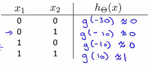 我们的输出函数 h θ ( x ) h_\theta(x) hθ(x)即为: h Θ ( x ) = g ( − 30 + 20 x 1 + 20 x 2 ) h_\Theta(x)=g\left( -30+20x_1+20x_2 \right) hΘ(x)=g(−30+20x1+20x2)