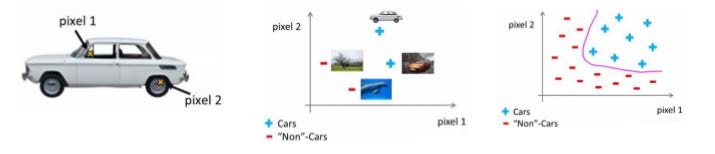 假设我们希望训练一个模型来识别视觉对象(例如识别一张图片上是否是一辆汽车),我们怎样才能这么做呢?一种方法是我们利用很多汽车的图片和很多非汽车的图片,然后利用这些图片上一个个像素的值(饱和度或亮度)来作为特征。
