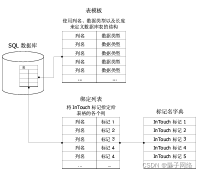 您可以将“InTouch 标记”映射到数据库列。这是通过“绑定列表”来完成的。大多数 SQL Access 函数都通过“绑定列表”来使得 InTouch 标记可以访问 SQL 数据库表中的数据。“绑定列表”将数据库表列与 InTouch 的“标记名字典”中的标记关联起来。“绑定列表”还包含一个描述数据库表格式的“表模板”。运行包含 SQLInsert()、SQLSelect() 或 SQLUpda