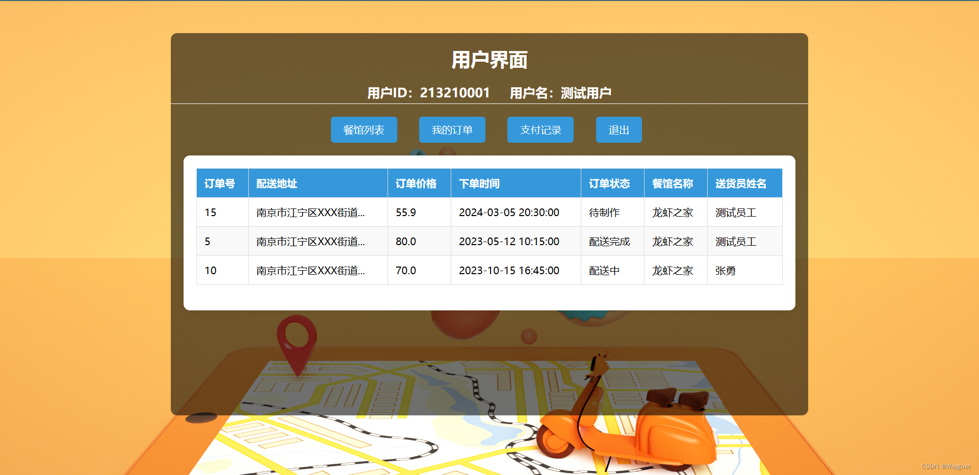 接下来测试骑手界面。输入骑手账号登录之后,可以看到骑手界面提供三种搜索操作以及退出操作,分别是