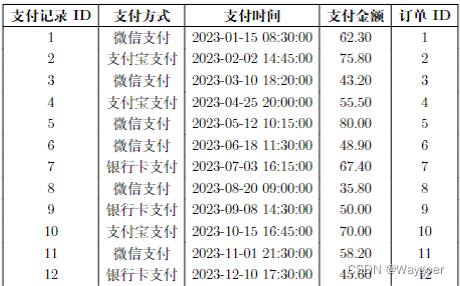 示例三: 支付记录(支付记录ID,支付方式,支付时间,支付金额,订单ID)