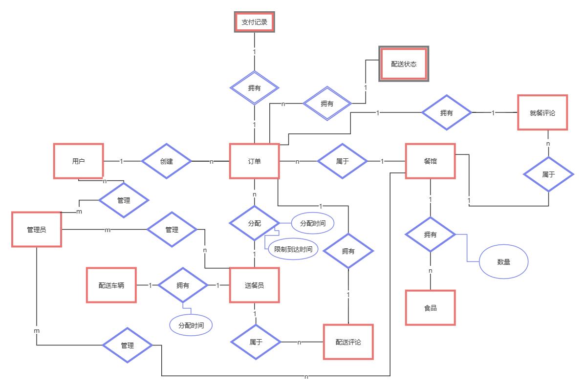 - 送餐员和配送车辆之间的“拥有”关系附带了“分配时间”的属性,表示送餐员是在什么时候拥有的配送车辆;