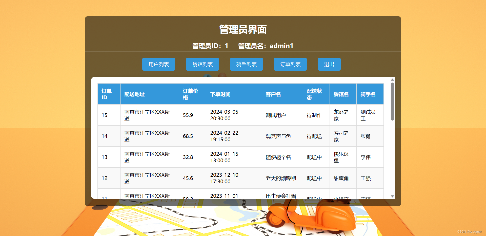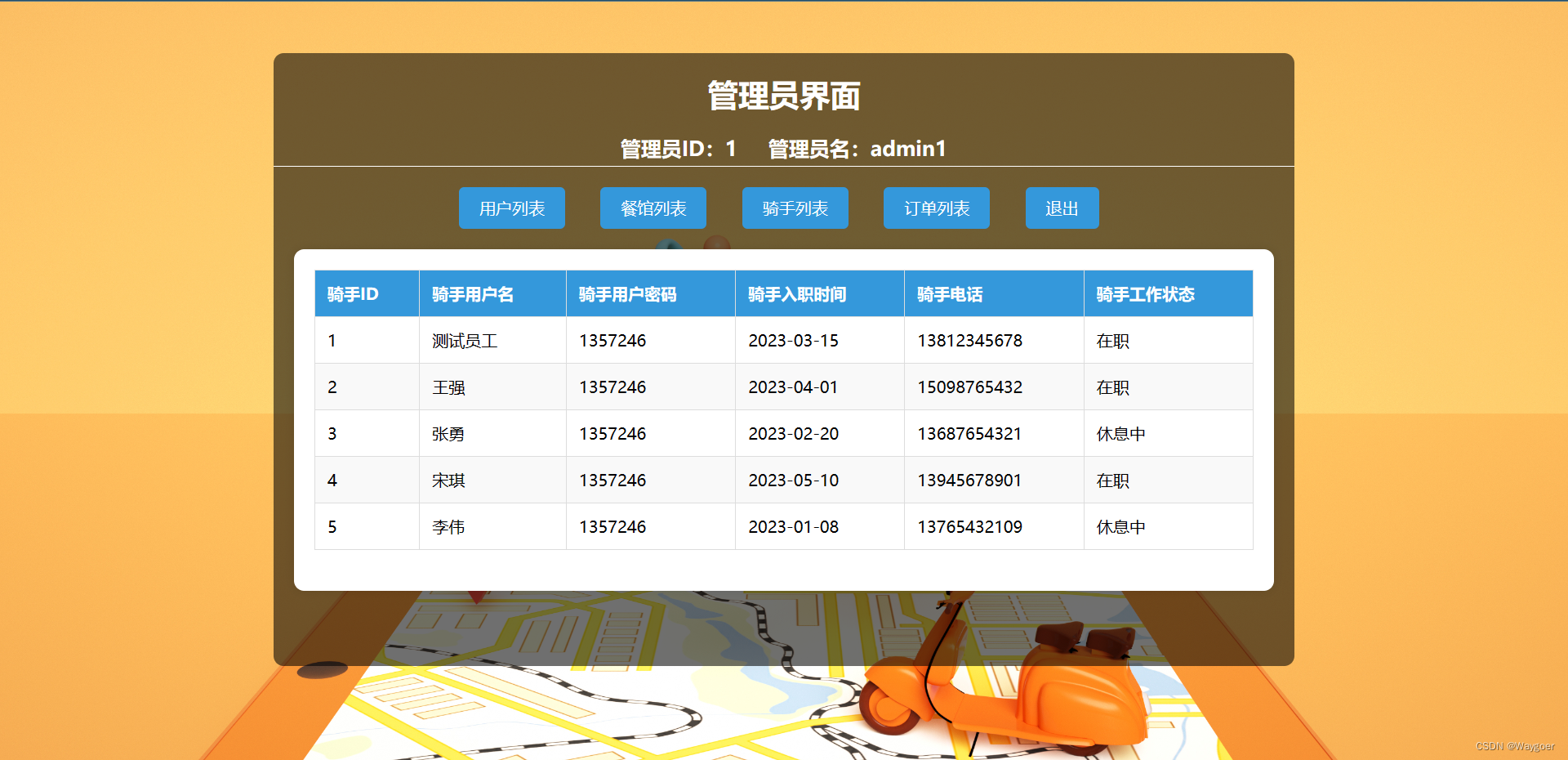 (3)骑手列表——可用于查看系统中的所有骑手信息,如下图