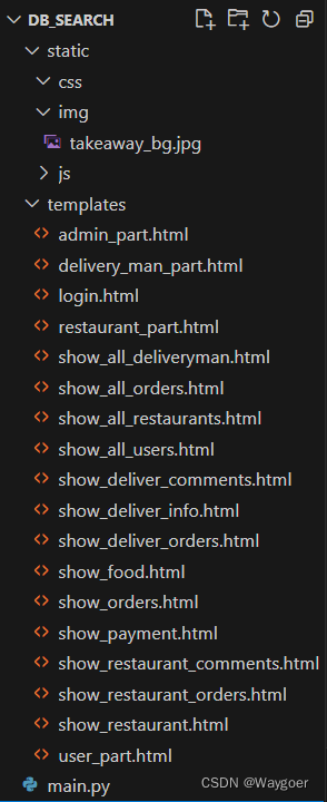 完成数据插入后,接下来使用Python搭建Flask框架,实现一个简单的外卖系统的搜索功能。框架结构如下图所示。其中img是用于页面背景插图,templates中是定义好的若干页面,主函数在main.py中运行,其中包含了页面跳转路由以及数据库操作。