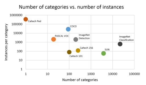COCO数据集是微软构建的一个数据集,其中包括detection, segmentation, keypoints等任务。从前面的图片也可以看出,COCO数据集的类别总数虽然没有 ImageNet 中用于detection的类别总数多,但是每个类别的实例目标总数要比PASCAL和ImageNet都要多。