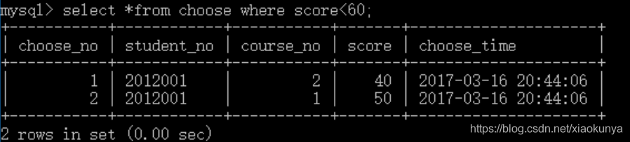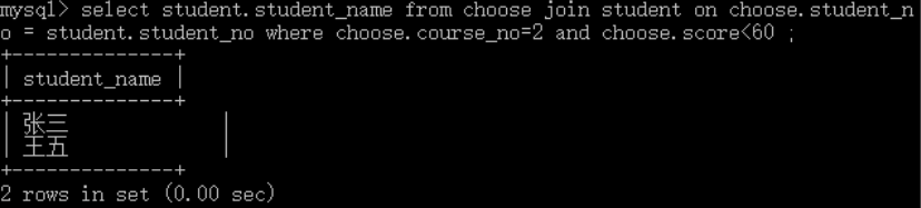 - 查询choose表中课程编号2的不及格的学生姓名。