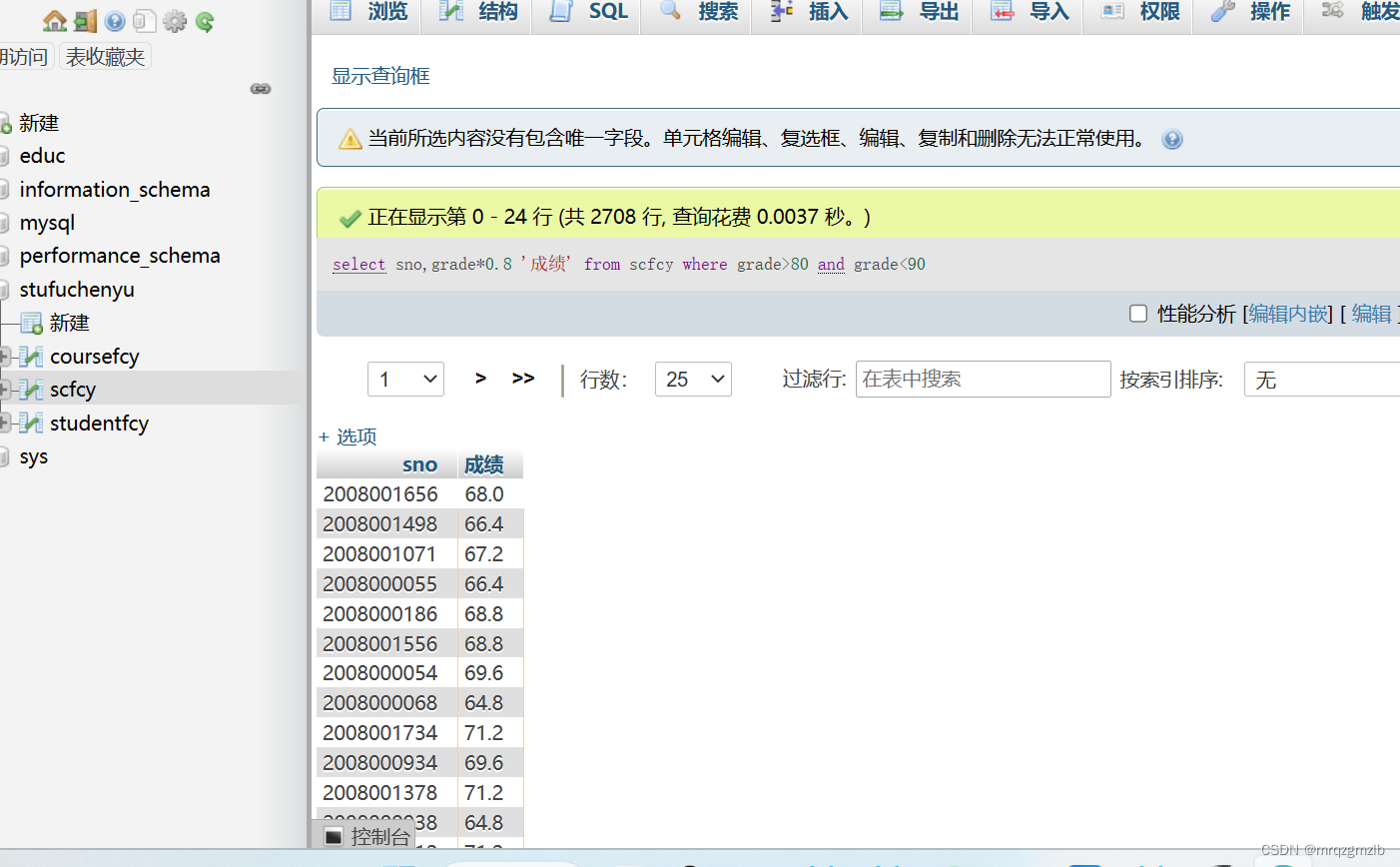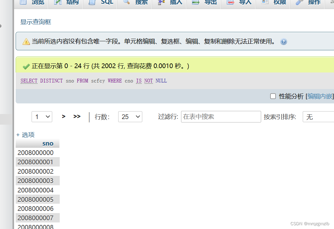 从名为scfcy的数据库表中,按照sno字段进行分组,然后返回每个组的第一个记录的sno值: