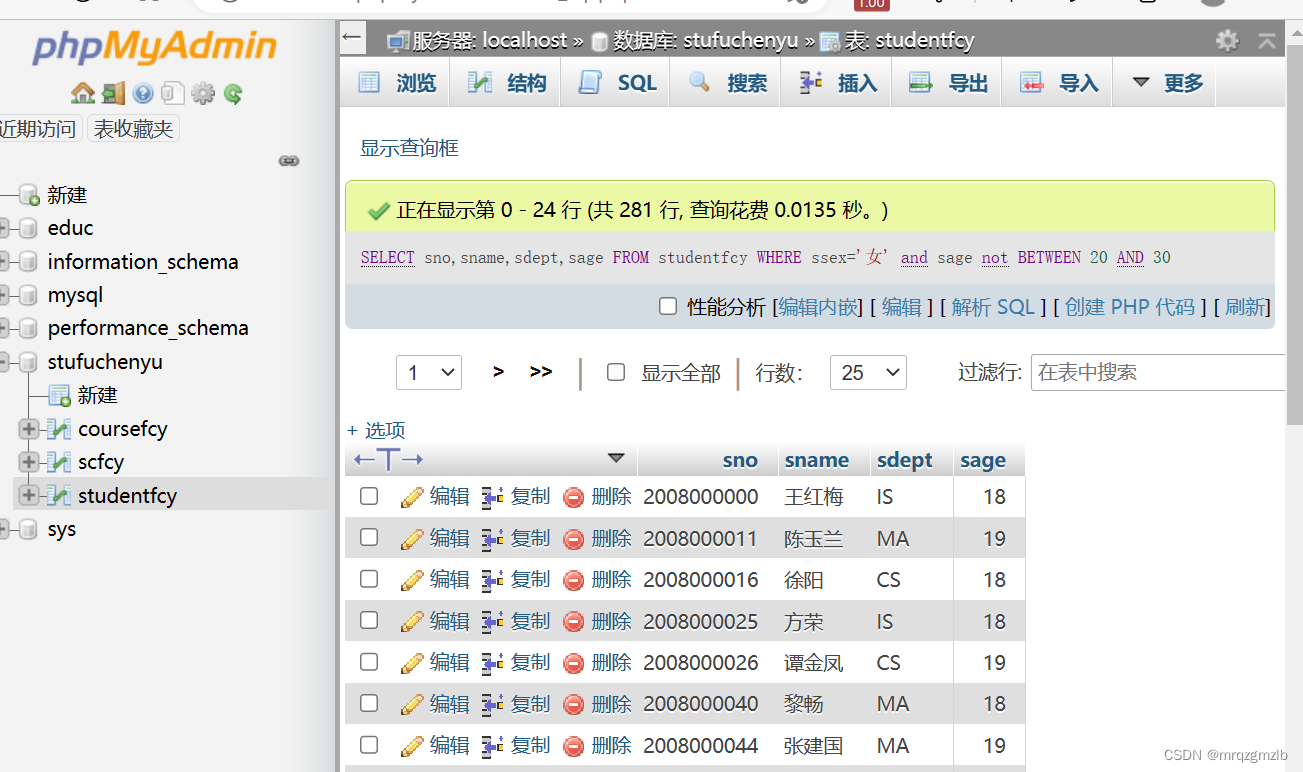 4、查询年龄不在20-23岁之间的女生的学号、姓名、系别和年龄。