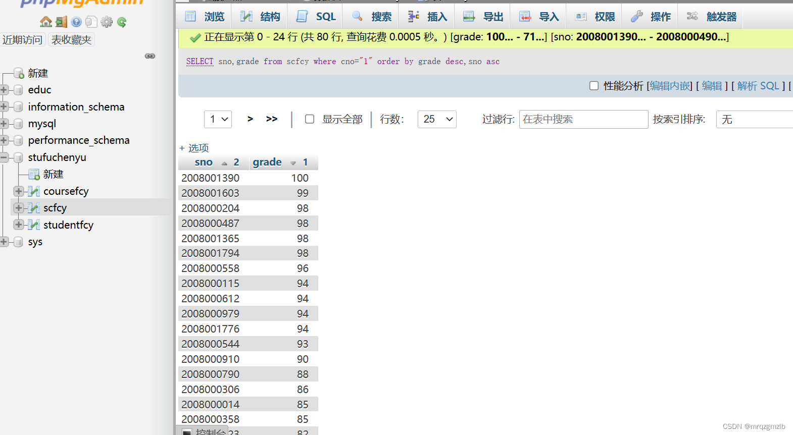 SELECT sno,grade from scfcy where cno="1" order by grade desc,sno asc