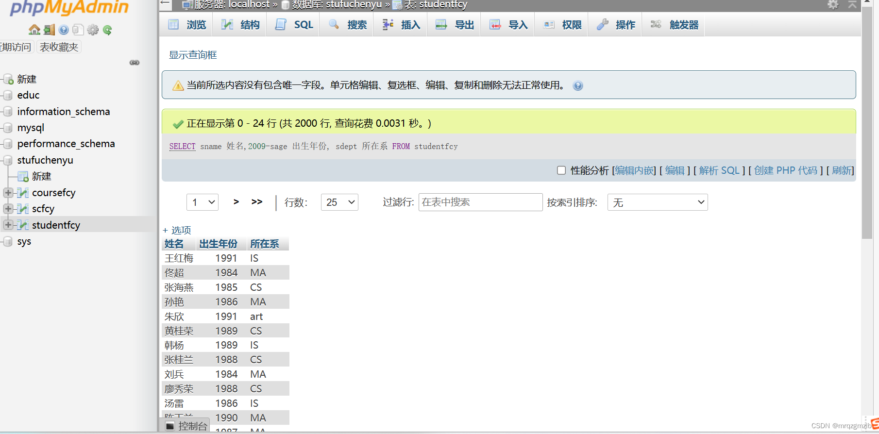 1.查询全体学生的姓名、出生年份和所在系。