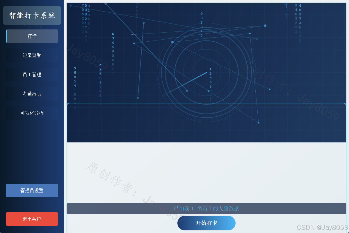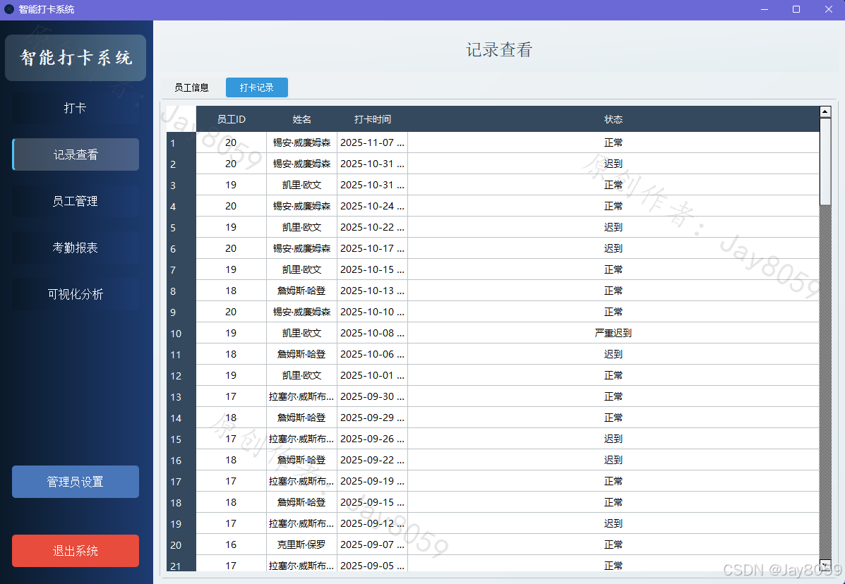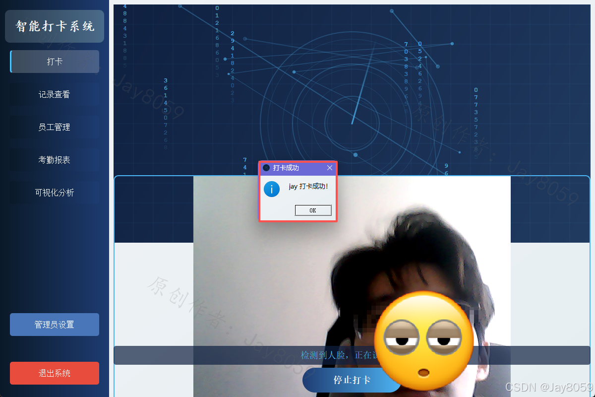 基于Python、PyQt5和OpenCV的人脸识别考勤系统,具有打卡、员工管理、考勤记录和报表生成等功能。