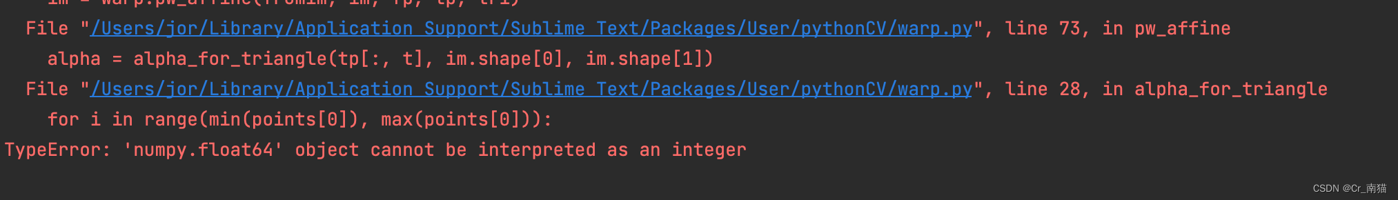 根据错误我们看到 warp.py 中的 alpha_for_triangle(points, m, n) 函数,报错说明min()和max()的参数是float64类型,应该将之转换成int类型。