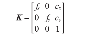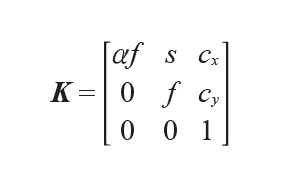 f为图像平面和照相机中心间的距离,当像素数组在传感器上偏斜时,需要用到倾斜参数s,一般情况下s可以为0,即: