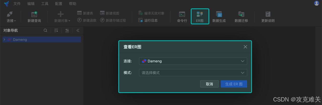 1.首先打开软件,进入主界面,点击“ER 图”。选择所需的数据库连接和模式,点击 生成 ER 图;也可在对象导航栏中,选择指定的数据库模式,右键单击 查看 ER 图。