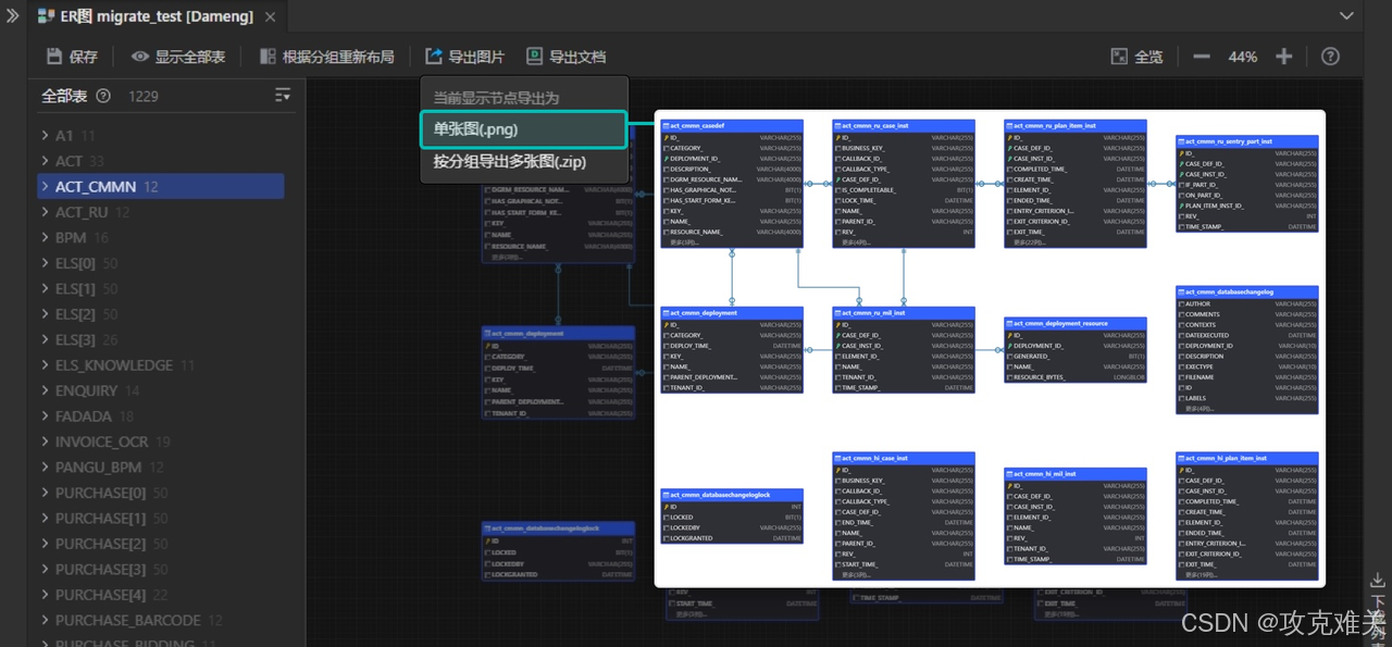5.保存后可以选择导出为:图片格式、按分组导出多张图、导出表设计文档(不同方式的导出按钮位置不同。)