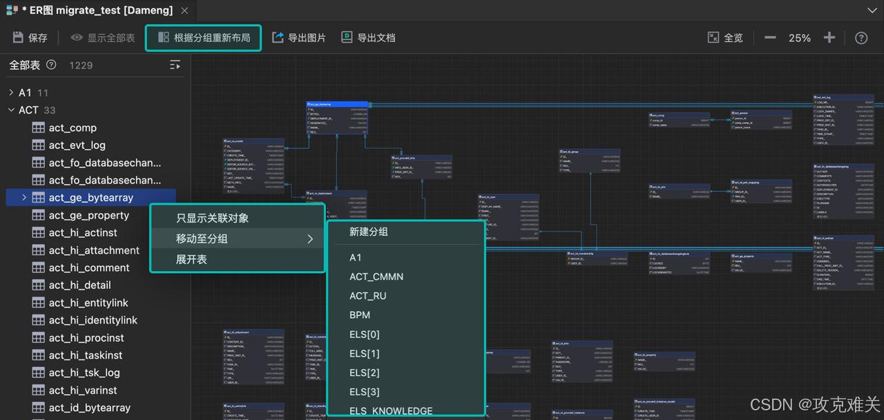也可以编辑分组,选中所需移动的表,右键菜单点击 移动至分组,并选择目标分组或新建的分组。然后重新布局 ER 图,完成调整后,点击 根据分组重新布局 ,将更新并展示新的 ER 图。
