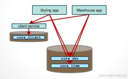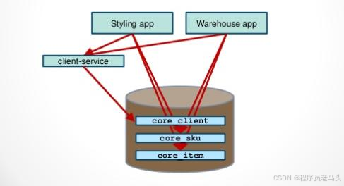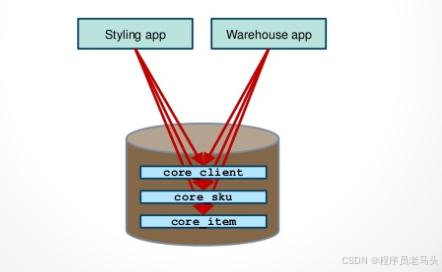 我们用上面的图来做例子。它共有两个程序,一个是“Styling app”,另一个是“Warehouse app”,它们共享图中下面的数据库,库里有三张表,“core client”,“core sku”,“core item”。