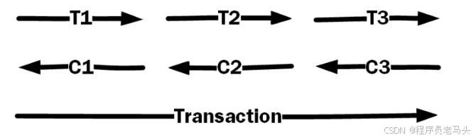 微服务的一个难点是如何实现跨服务的事物支持。两阶段提交(Two-Phase Commit)已被证明性能上不能满足需求,现在基本上没有人用。被一致认可的方法叫Saga。它的原理是为事物中的每个操作写一个补偿操作(Compensating Transaction),然后在回滚阶段挨个执行每一个补偿操作。示例如下图,在一个事物中共有3个操作T1,T2,T3。每一个操作要定义一个补偿操作,C1,C2,C3。事物执行时是按照正向顺序先执行T1,当回滚时是按照反向顺序先执行C3。 事物中的每一个操作(正向操作和补偿操作)都被包装成一个命令(Command),Saga执行协调器(Saga Execution Coordinator (SEC))负责执行所有命令。在执行之前,所有的命令都会按顺序被存入日志中,然后Saga执行协调器从日志中取出命令,依次执行。当某个执行出现错误时,这个错误也被写入日志,并且所有正在执行的命令被停止,开始回滚操作。